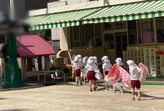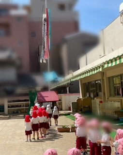 GWの中日の今日、晴天のもと、こどもの日の集いを行いました。こどもの日についてのお話を聞いて、ゆり組がこいのぼりをあげ、元気いっぱいに体を動かして楽しもうと、体操、かけっこ、リレーをしました。こいのぼりも途中から、元気に泳ぎ出しました。