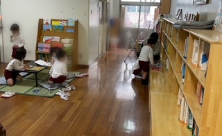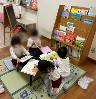お昼から雨が降り、新しい絵本コーナーで、ゆったりと絵本を楽しむこどもたち。ほっこりしますね。
