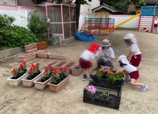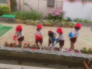 ゆり組がプランターに土を入れてくれたところに、ゆり組とばら組でお花を植えました。色を選びながら植えていました。後はしっかり水やりをしました。きれいな花を咲かせてね。