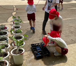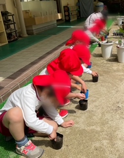 ばら組が、ポットに朝顔の種を蒔きました。芽が出てきたら、プランターに移し替えます。さあ、いつ芽が出てくるかな。楽しみです。