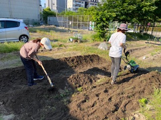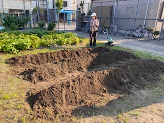 近隣の畑でサツマイモ掘りができるように、畑を耕して、畝をつくりました。苗植えに向けて頑張りました。