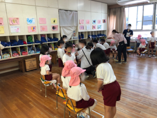 ?ゆり組が自己紹介をして、もも組の名前を聞いて、園外散歩のペアになって階段を昇ったり遊戯室で体を動かして遊んだりしました。