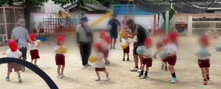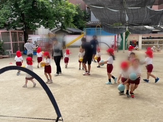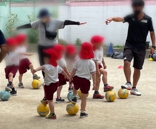 ばら組は、準備運動の後に1人一つのボールを持って鬼ごっこやいろいろな動きをして慣れた後、ゴールにシュートを決めていました。楽しかったようで、またやりたいと笑顔で話していました。