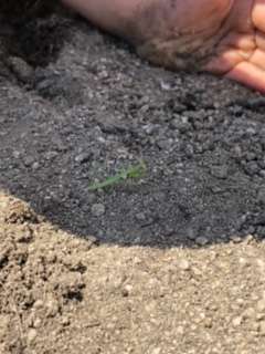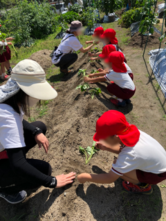 畝に寝かせて、ぽかぽか温かい土のお布団をかけました。最後に園長先生が、たっぷり水やりをしてくれました。暑くなってきたから、また水やりに来ようね。
