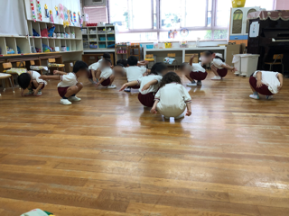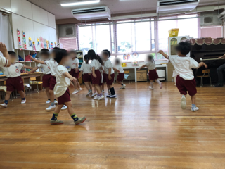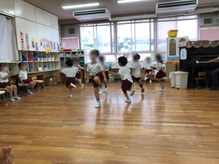 片足でバランスをとって、けんけんをしました。半数ずつ交代ですることで、友達の頑張っている姿を見たり、見てもらったりして、お互いに刺激を受け合っていました。