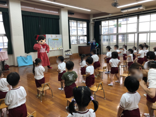 着ぐるみ(誘拐犯)の「ゆうかい するぞう」の顔は覚えているかな?どんな服装だったかな?と皆で思い出したり、「ついていかない体操」をしたりしました。