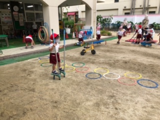ゆり組のチャレンジ遊びが少し落ち着くと、年長児がこつこつ頑張っていたのを見ていた ばら組も竹馬にチャレンジしていました。