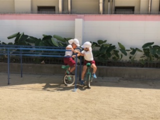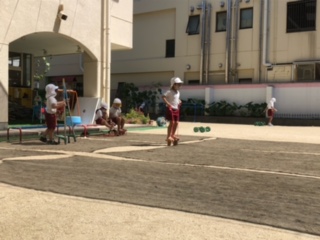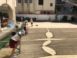 ゆり組が竹馬、一輪車、一本歯下駄など、いろいろな遊びにチャレンジしていました。
