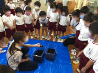 もも組にたくさんのカブトムシの幼虫が生まれたので、ゆり組と分けました。元気に育つといいね!