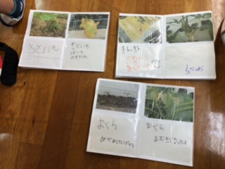 見せてもらうと、『ゆりぐみずかん』でした。春と夏の図鑑と、作成中の図鑑がありました。園庭の草花や育てている野菜の名前と気付いたこと(生長していたこと、葉っぱや花の色など)が書かれていました。1ページ1ページから、よく見ていることや大切に作ったことが伝わってきました。