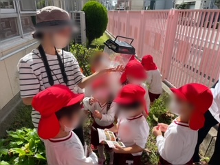 朝晩が冷え込み、秋の深まりを感じます。園庭の草花も少なくなり、ばら組が園舎裏に探検に行くことにしました。エノコログサがたくさん咲いていて、手の中で動かすマジックにも挑戦しました。赤い小さな実を見つけ、「なんだろう」「うーむ、これは」と秋のミニ図鑑を開いて調べていました。バッタは見つからず園に戻りかけた時に、大きなバッタを発見。図鑑を見て「ショウリョウバッタや」「でも、口が赤いよ」など話し合ううち、週末に。「土日も幼稚園に置いておきたい」となりました。