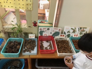 ドングリも「ほそながい」「まるい」「ちいさい」ものがあって、ここから選んでカップに入れて、ドングリ転がしをしていました。