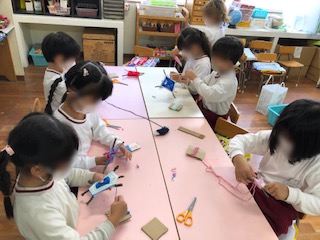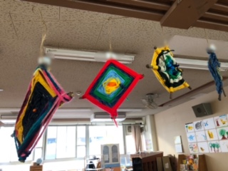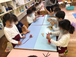 大阪城公園で拾った木の枝で、毛糸の飾りをつくりました。「編み物みたい〜」「こんなに編めたよ」と友達と見合いながらつくっていました。初めは難しく感じていた子どもたちも、規則性が分かると、楽しさや毛糸の色を変えて色合いの美しさを感じていました。