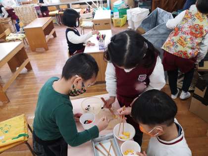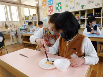 ゆり組(5歳児)さんに、お箸の正しい持ち方を指導しました。普段から上手にお箸を持てている子が多いゆり組さん。指導では、先端に切り込みが入っていないプラスチック製のお箸で、フェルト製のおにぎりや野菜、ツルツルした豆などを正しい持ち方で掴めるか挑戦!難なく掴めている子もいれば、苦戦している子もいましたが、2人1組で交代で挑戦したことで、隣で見守っていたお友達が手を添えるなど、助けてくれていたり、掴めた時には一緒に喜んだりする姿もありました。