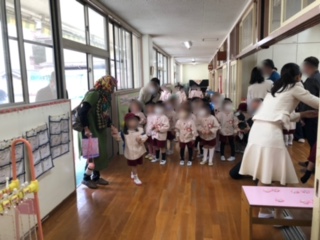 ばら組は「おはようございます」と廊下で挨拶をし、ゆり組は「おめでとうございます」と新しいお友達を迎えていました。
