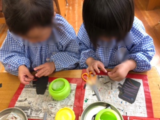 ダンゴムシをつくったよ! 公開日 2023/04/18 更新日 2023/04/18 お知らせ ?ばら組が園庭で、ダンゴムシ探しを楽しんでいます。「あしがいっぱいあるの!」「つのみたいなのもあるよ!」と、よ〜く見ています。 今日は、画用紙をハサミで切ったり、糊で貼ったり、パスで目や背中のしましまをかいてつくりました。 にっこり笑ったダンゴムシやカラフルなダンゴムシ。今にも動き出しそうなダンゴムシができました。楽しかったね! いいね(0)