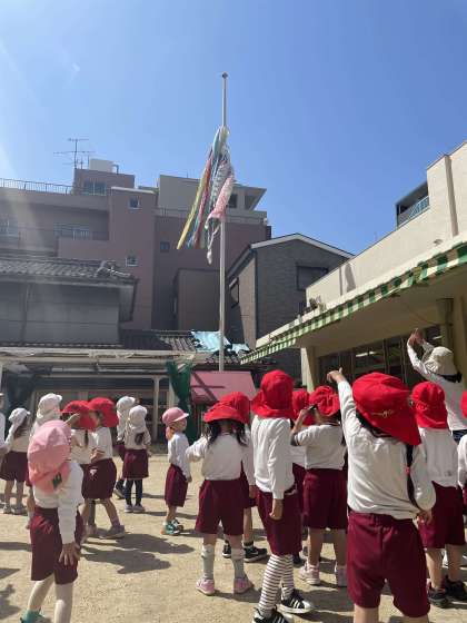 きれいな青空のもと、鯉のぼりの由来の話やこどもの日についての話を聞いたり、鯉のぼりを掲揚する様子をみんなで見たりしました。
