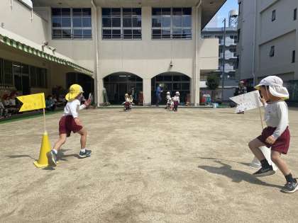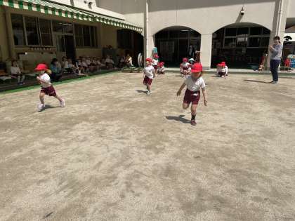 3歳児、4歳児はこいのぼりまでみんなでかけっこ!5歳児は、2チームに分かれてタッチリレーをしました。