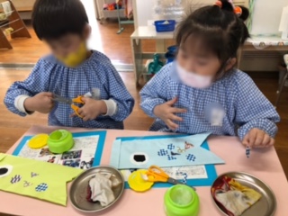 指先を使うので難しいですが、ゆり組は諦めずに根気強くつけていました。付け終わったら、付け方を友達に教える姿も見られました。さすがゆり組だね!
