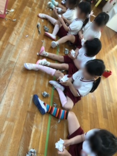 ばら組は紙を丸めて、黒いテープを貼って…、おにぎりができました!