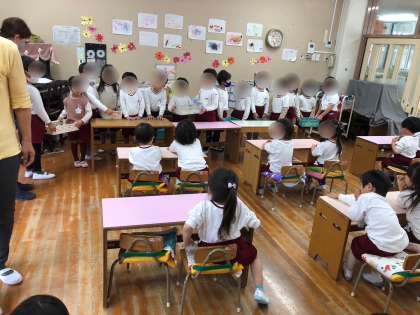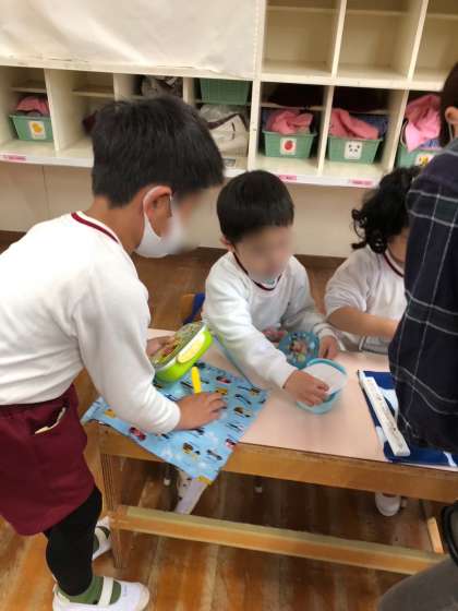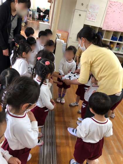 お弁当ごっこ(当日編その1) 公開日 2023/05/09 更新日 2023/05/09 お知らせ いよいよお弁当ごっこ当日です。ゆり組、ばら組のお兄さん、お姉さんが、先日つくったお弁当のおかずやおにぎりを届けにきてくれました。とってもおいしそう! その後、ゆり組さんがお弁当の用意を手伝ってくれました。「お箸も出すよ」「ナフキンは下に敷くよ」と、優しく教えてくれました。 さぁ準備ができたらお弁当屋さんに出発だ!【その2へ続く…】 いいね(0)