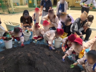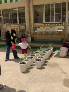 ばら組・ゆり組は経験がありますが、もも組にとっては初めての苗植えです。お家の人と一緒に苗植えをして、お水をしっかりあげました。最後に絵をかいた札を立てました。美味しい野菜が育つかな?楽しみだね!