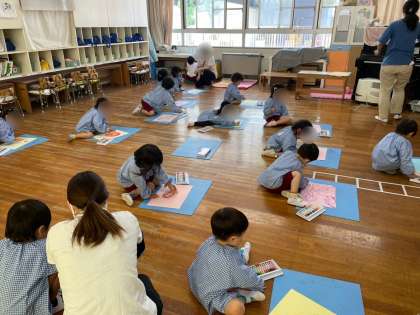 その前に、まずはアトリエ着を着ます。担任は、「自分で着られるかな?前と後ろ、合っているかな?」と、声をかけ、必要に応じて援助をし、自分で着ようとする姿はしっかりと認める声かけをしています。自分のことを自分でしようとすることは3歳児のこの時期にとても大切なことですね!