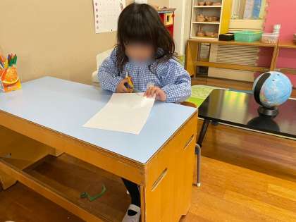 ハサミで何かの形を切り、それを持って絵の具コーナーへ。