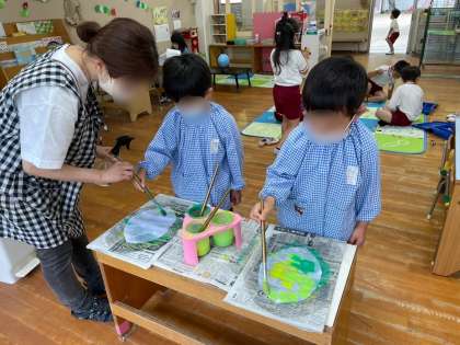 ゆり組さんは、ハサミや絵の具で何かをつくっていたので、覗いてみました♪