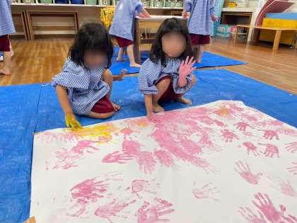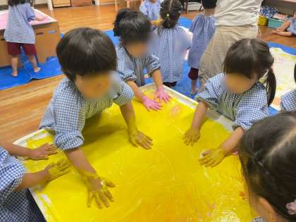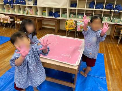 もも組は、プレートにゆびえのぐ(←専用の絵の具です。少しもったりとしており、なんとも心地の良い感触です)を出して、存分に楽しみました。大きな紙も用意してあり、手形遊びをしたり、また絵の具に戻ってきて感触や塗り広げ、指を使って線や絵をかくことを楽しんだりと、繰り返し遊んでいましたよ。