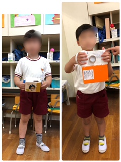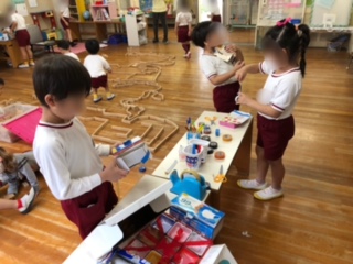 ゆり組では、空き箱や容器を自由に使えるようにしてあり、この日も子どもたちがいろいろとつくって遊んでいました。