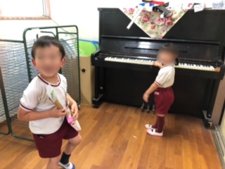 この日は実は園外保育の予定でしたが、延期となりました…。動物園に行きたかったという思い、シロクマのホウちゃんに会いたかったという思いを込めた作詞作曲の歌を聞かせてくれました!(静止画なのが残念!!)ピアノとのセッションも楽しんでいました。