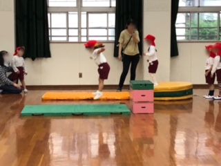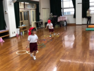 フープや巧技台、トランポリンなどを組み合わせてコースにし、周回しながら繰り返し遊べる「サーキット遊び」もしました。遊びながら、ケンケンパや跳ぶ、くぐるなどいろいろな動きが経験できます。