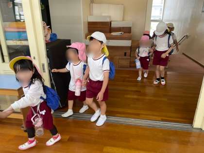 もも組とゆり組は手をつないで2階へ上がり、「信号が赤なので止まりまーす!」と遠足気分で遊戯室の中をグルっと回りました。