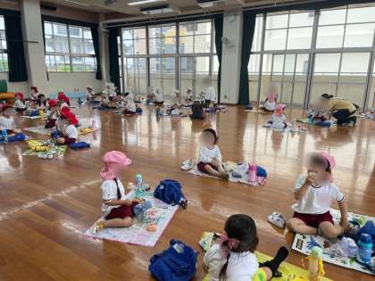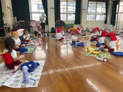 とっても残念でしたが、遠足の用意を持ってきているので、みんなで遊戯室で遠足ごっこをしました。