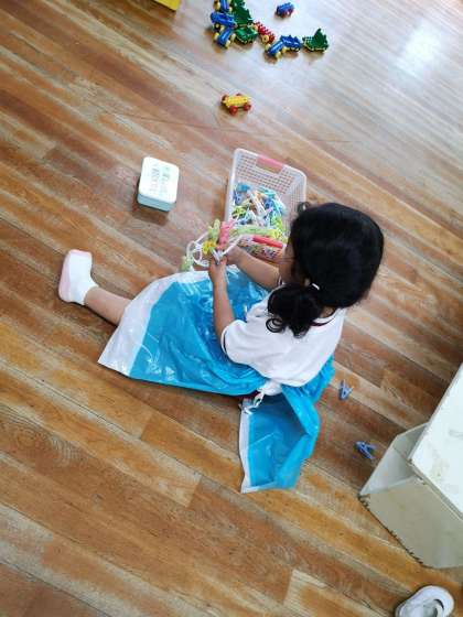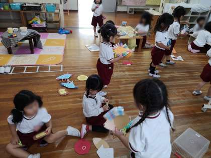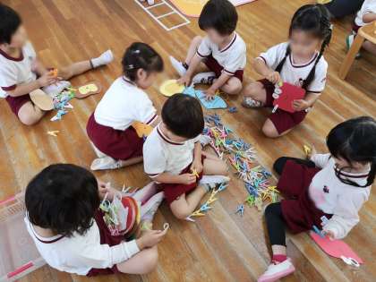 もも組さんがお部屋にあった洗濯ばさみ同士をくっつけて遊び始めました。そこで、色々な動物の形をした型紙と保健室にあった洗濯ばさみを貸し出しました。