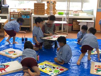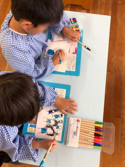 水性ペンでは細かなところまでかいたり、丁寧に色を塗ったりしました。後日、絵具でも絵をかきました。水性ペンとは違ってダイナミックにかきました。「白いタマネギと紫のタマネギがあった!」「ダイコンもとったよな!」と、今にも動き出しそうな絵をかいていました。絵をかいた後は先生が丁寧に話を聞いて、子どもたちの表現を受け止めていました。