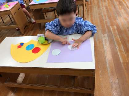 指についたのりは少しベタベタしますが、指拭きで拭いたら大丈夫!遊びを通して、指先を使うことや、のりの量を調整することを経験していきます。初めてのりを使いましたが、楽しそうにつくっていました。
