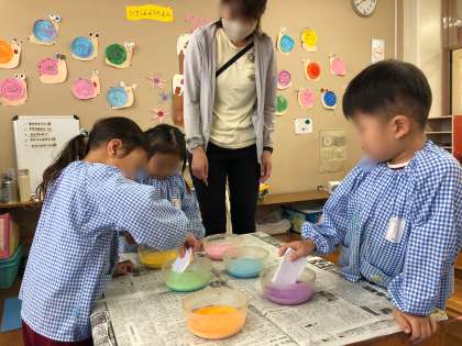 七夕の短冊は浸し染めをしましたよ。紙の角と角を合わせて3回〜4回折りました。色水に浸すと、ジワジワ〜を染まりました。「開けたらどんなんかな〜?」と楽しみにしていました。