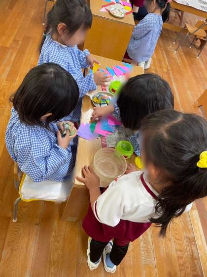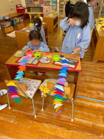 輪っかを繋げた「輪つなぎ」や三角を繋げた「三角つなぎ」など、日を分けてつくりました。繋げていく内に楽しさを感じて、「長〜くなってきた!」「もっと繋げよう!」とつくっていましたよ。友達と数えたり、背比べしたりしていました。持って帰るのが楽しみだね。