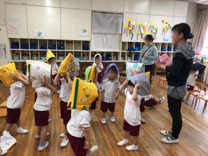 どこに頭を入れるのか、どの向きなのか、先生が知らせると意欲満々の子どもたちは、自分で被ろうと挑戦していました!!被り終えると友達と見合っていましたよ。