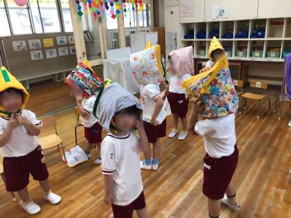 先日幼稚園では地震の避難訓練をしました。その前に、防災頭巾を自分で被れるかな?と練習をしていたもも組。