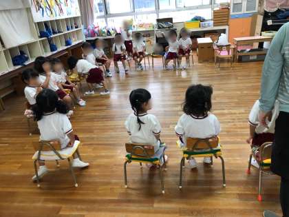 先生が座布団を椅子に戻すことを伝えると、自分でしようとしていましたし、自分でできるようになってきました(ちょっとゴムが太くてかたいのです)。座って先生の話を聞く姿も育ってきています。