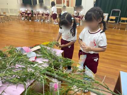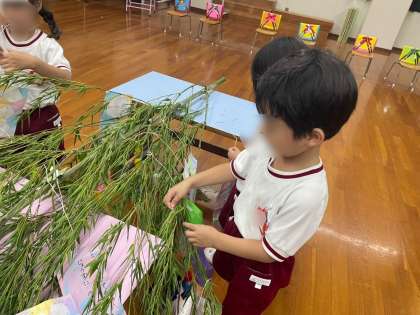 今日の7月誕生会・たなばたまつりに向けて、昨日、大きな笹に自分たちのつくった笹飾りと願い事を書いた短冊を飾りました。ばら組は、自分たちで笹に飾りを結びつけることに挑戦しました。指先を使った細かな作業になりますが、自分でやってみようと頑張っていました。