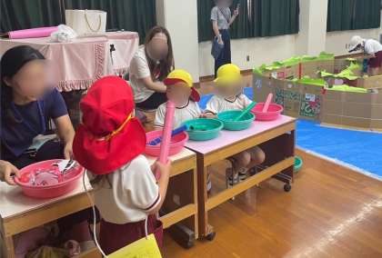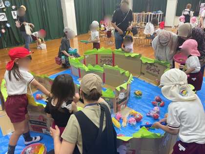 ボーリングや箱積み、ヨーヨー釣りなどいろいろな遊びのお店があり、前半後半に分かれて、お店屋さんとお客さんを交代して遊びました。