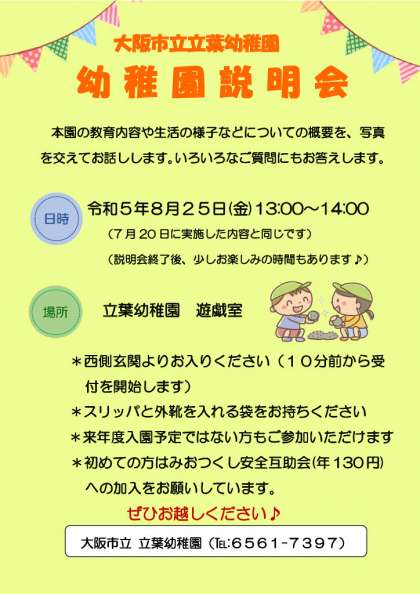 幼稚園説明会について、前回掲載した時間に訂正があります。