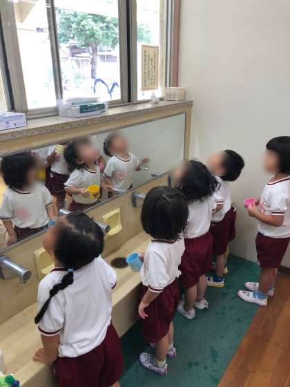 見事にガラガラうがいができた子どもや、鏡に映る自分が気になって水が流れてしまう子どもや…。初めてのことにも一生懸命チャレンジしていました。その姿を認めながら継続してできるように、過程を見守っていきたいです!