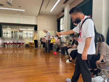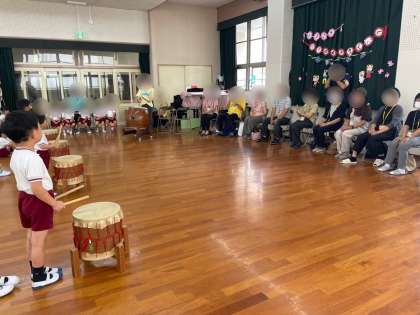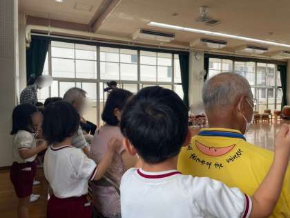 会の中では、おじいちゃんおばあちゃんの自己紹介を聞いたり、もも組ばら組の歌や、ゆり組の太鼓を見てもらったりました。その後、祖父母の方からも、歌やけん玉、コマ、お手玉などを見せていただきました♪