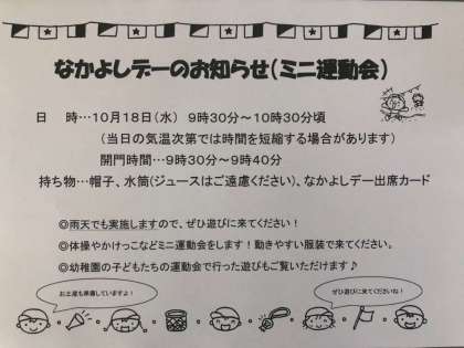 10月18日(水)にミニ運動会を実施します。体操やかけっこなどを一緒にしましょう♪