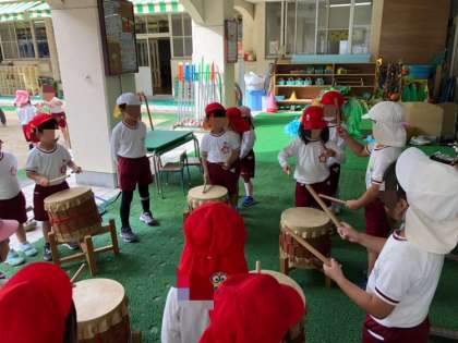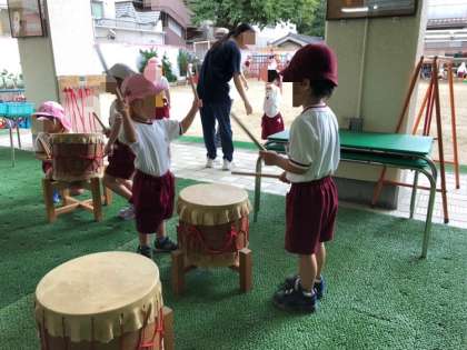 ゆり組への憧れが大きいようで、ばら組・もも組が、太鼓の叩き方を教えてもらっていました。運動会のオープニングで歌っていた歌を口ずさみながら、リズムに合わせて打とうとする姿がありました。